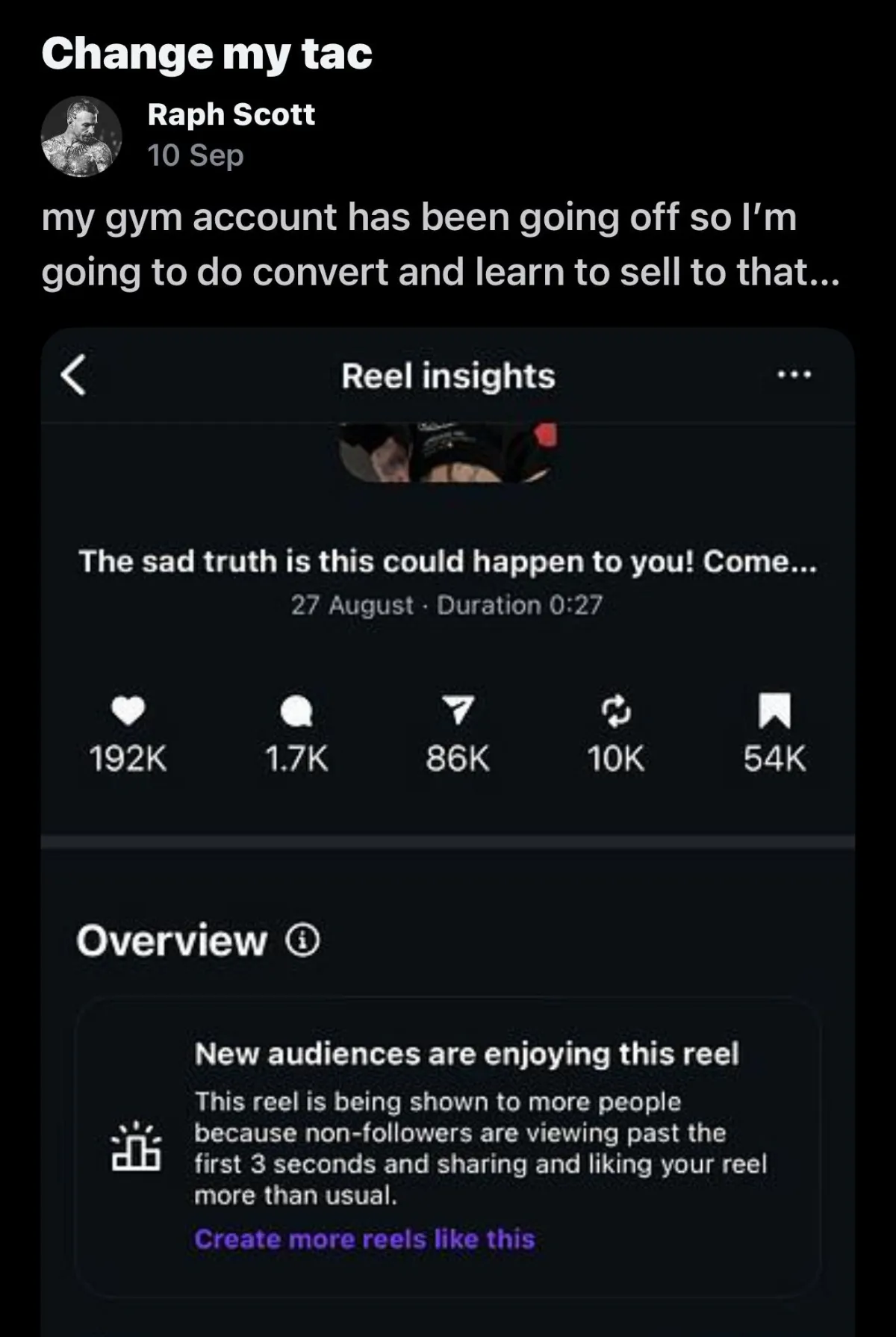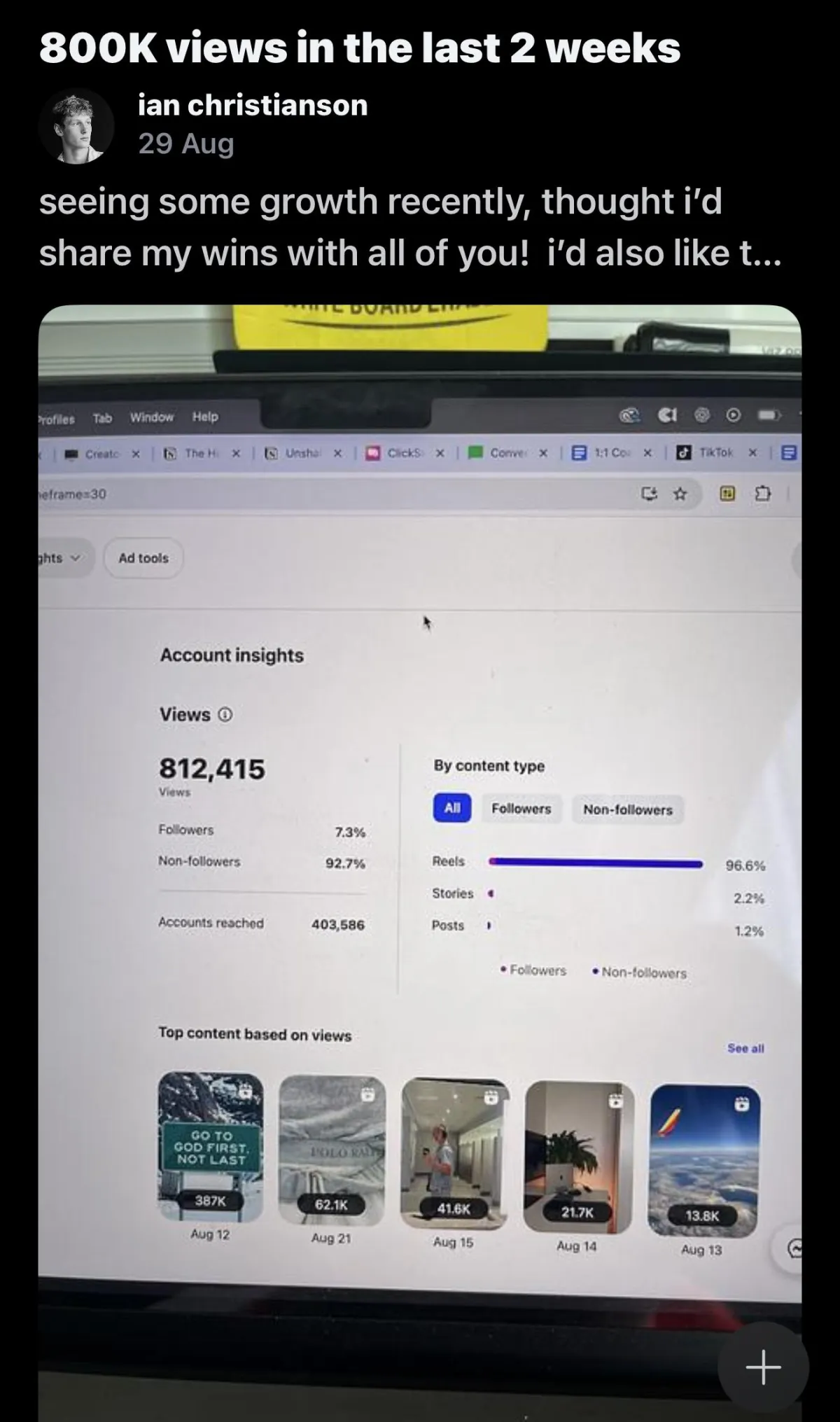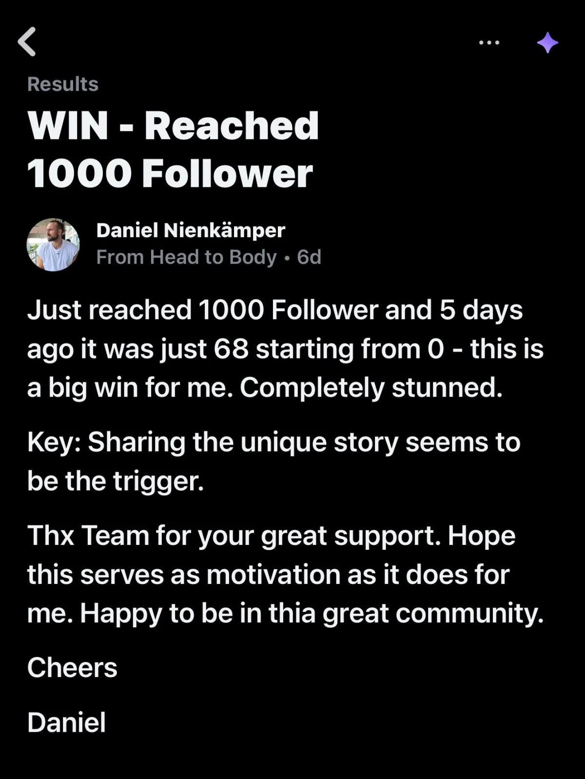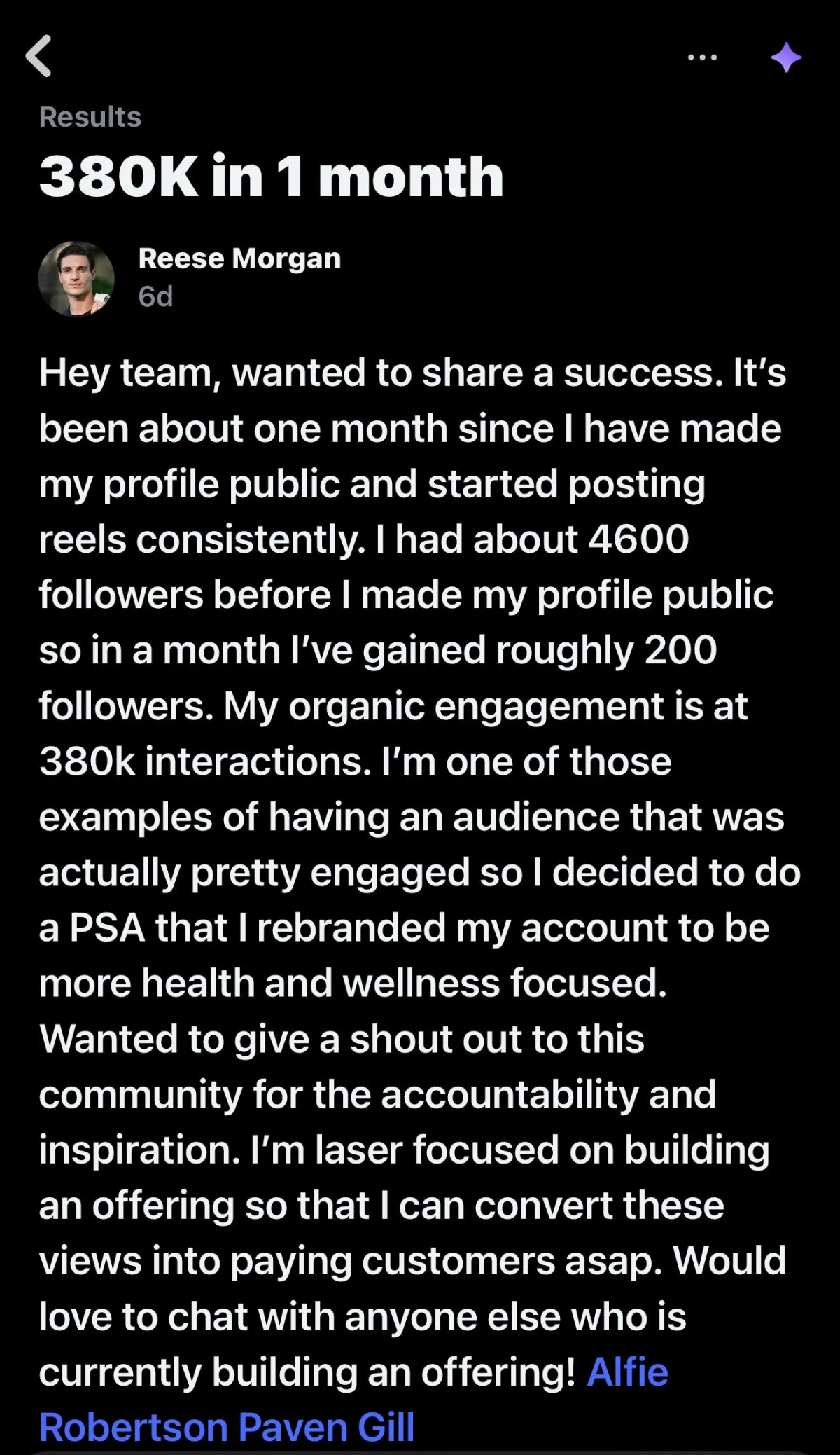 "These last 30 days have been crazy. 4K on IG and 22K on TikTok. Getting people coming at all angles just from the advice on how to setup an account. Being able to ask you, Ned, and Zedan questions on the weekly Q&A makes this a lot less lonely path.