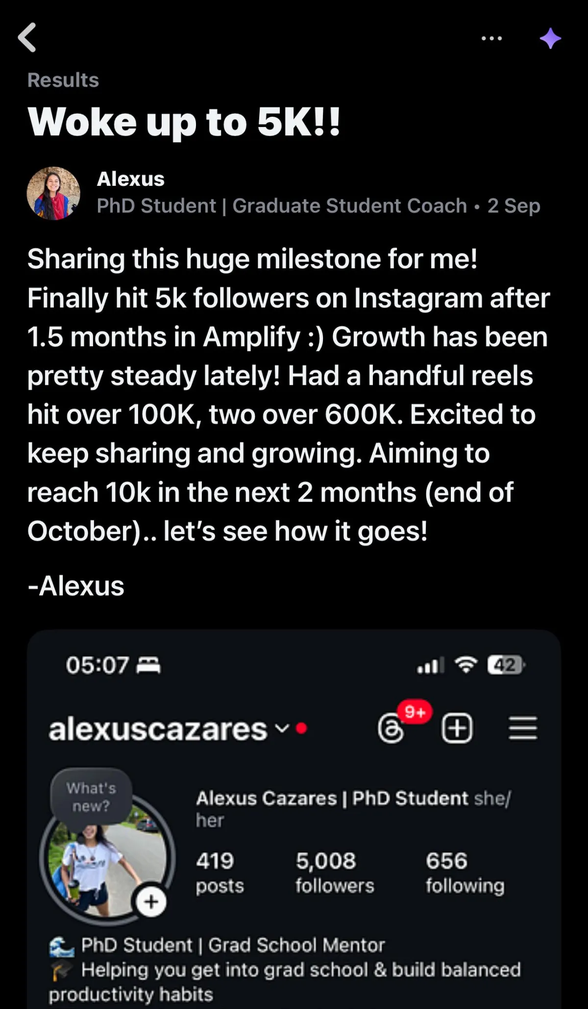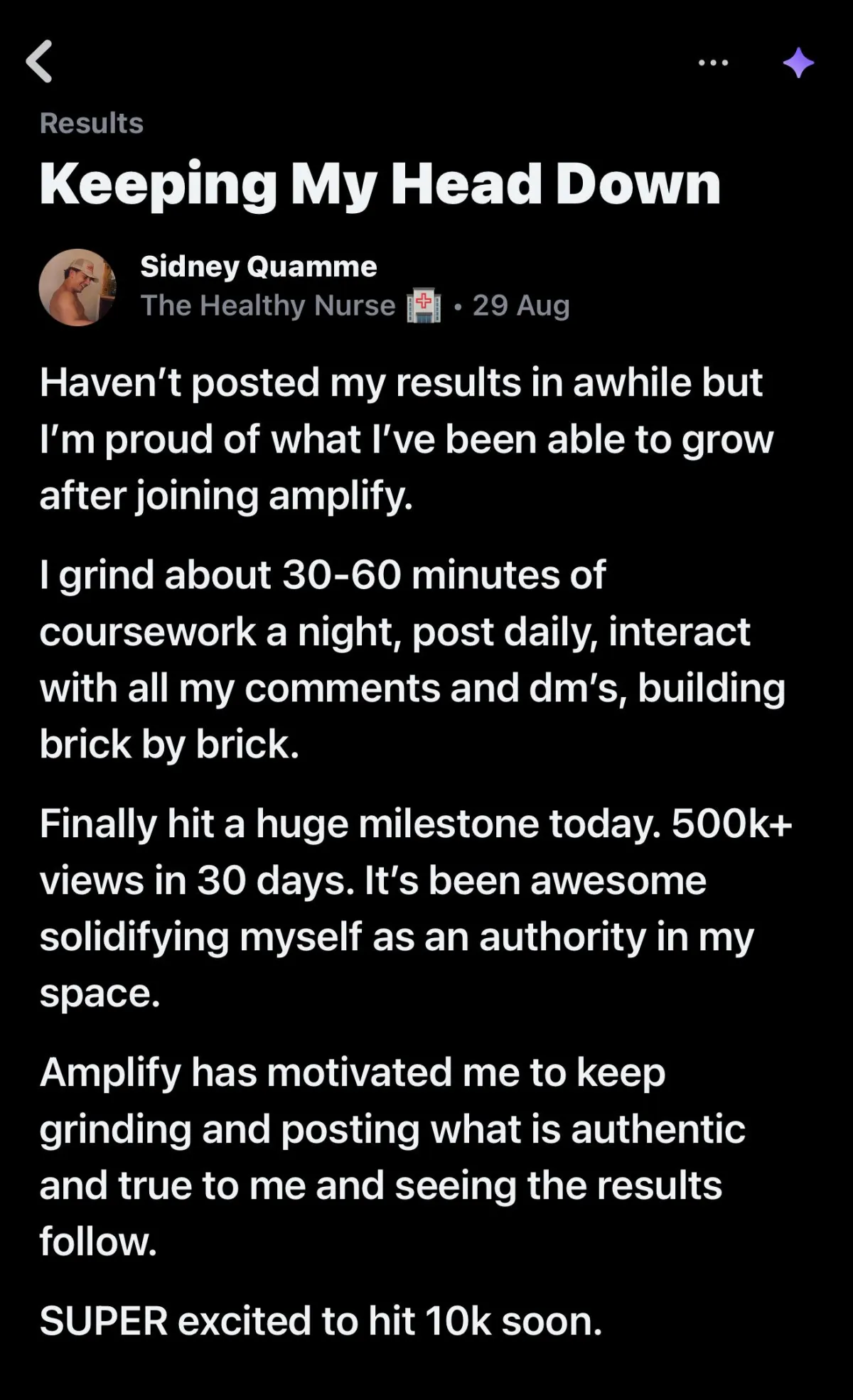 "I hit 4K followers after six months of grinding, then joined Amplify. Just one small shift from authority to documentation made my content explode. I finally got the structure I needed, and my growth doubled. Amplify is an unbelievable service, especially if you’re starting out and want real results"
