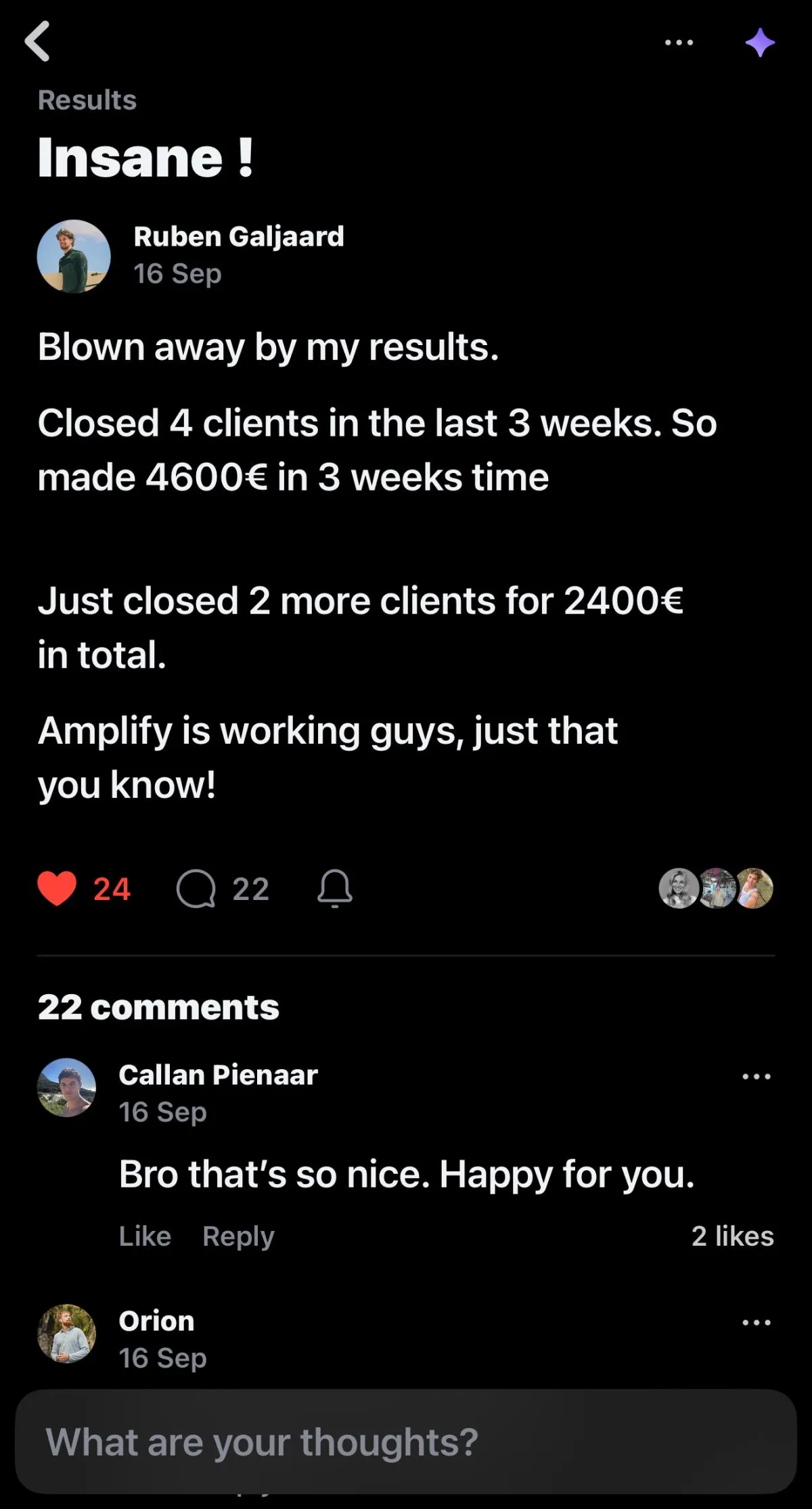"After just two days inside Amplify, we had their most viral post ever by following the content files exactly. Every piece since has performed well. We've love the proactive support, valuable Q&As, and community that always helps with feedback, calling it far more personal and valuable than any other program we've joined"