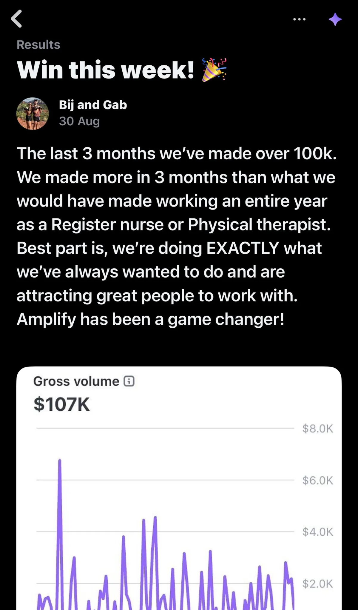 Amplify changed my life. I went from $5–10K months to over $1M in six months with their roadmap, sales funnel, and support. It gave me the foundation to scale, build a 35+ person team, and join a community of like-minded creators. Truly the game changer in my business journey.