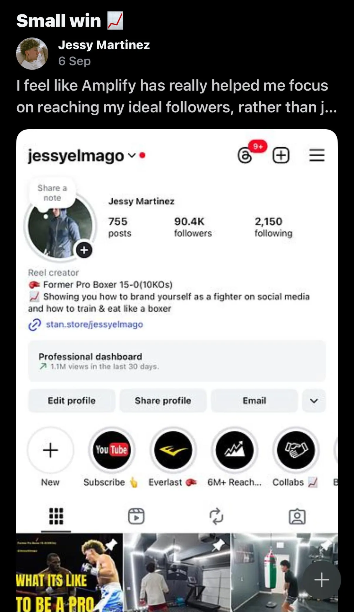 "I now have 11K followers and signed my first client within 2 weeks of signing up with Amplify with less than 1,000 followers. My focus was making back the money I made now I can properly scale my business"