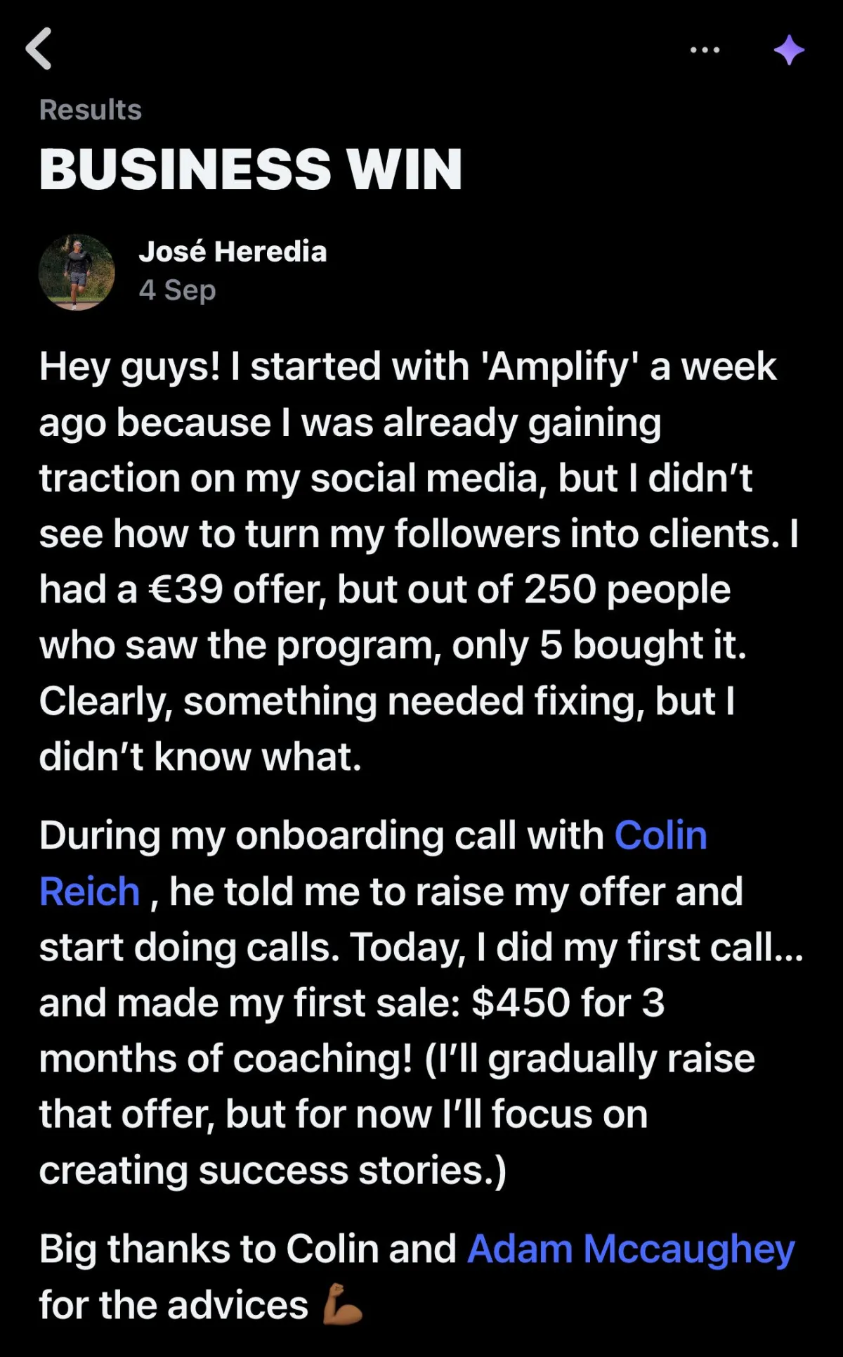 "First month of Amplify I did $10K+ in coaching... Before I was just a hustler, I didn't know how much value I could deliver and how much I could charge for my coaching."