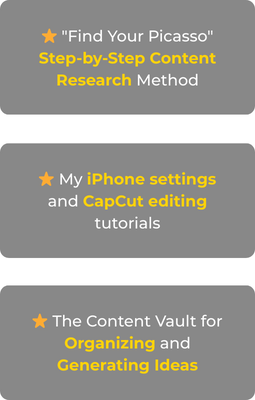 You're getting the complete 6-step framework I used to go from 0 to 100K followers in 100 days. This includes algorithm education for Instagram/TikTok, the "Find Your Picasso" creator research method, content planning templates you fill out yourself, iPhone settings and CapCut tutorials, plus one content audit session where I review your work.